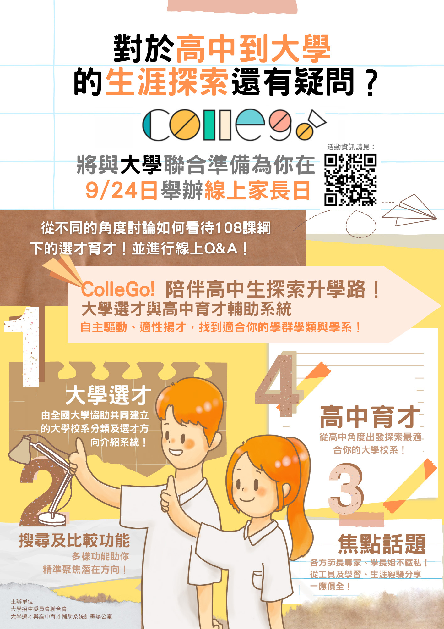 一、選育系統為教育部配合十二年國教課綱規劃發展,為促進高中家長、師生了解大學選才及高中育才相關資訊,計畫辦公室提供系統簡介與「ColleGo! 家長日」活動預告插頁檔案(見附件)及活動說明連結(https://collego.edu.tw/Media/Article/308),敬請依需要納入學校親師手冊,或透過導師或家長網絡轉發,並轉知貴校師生。