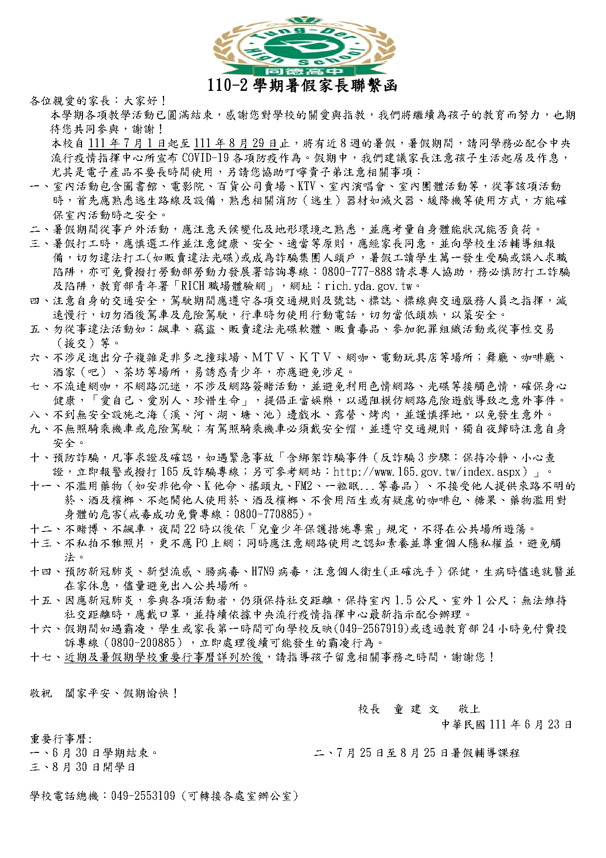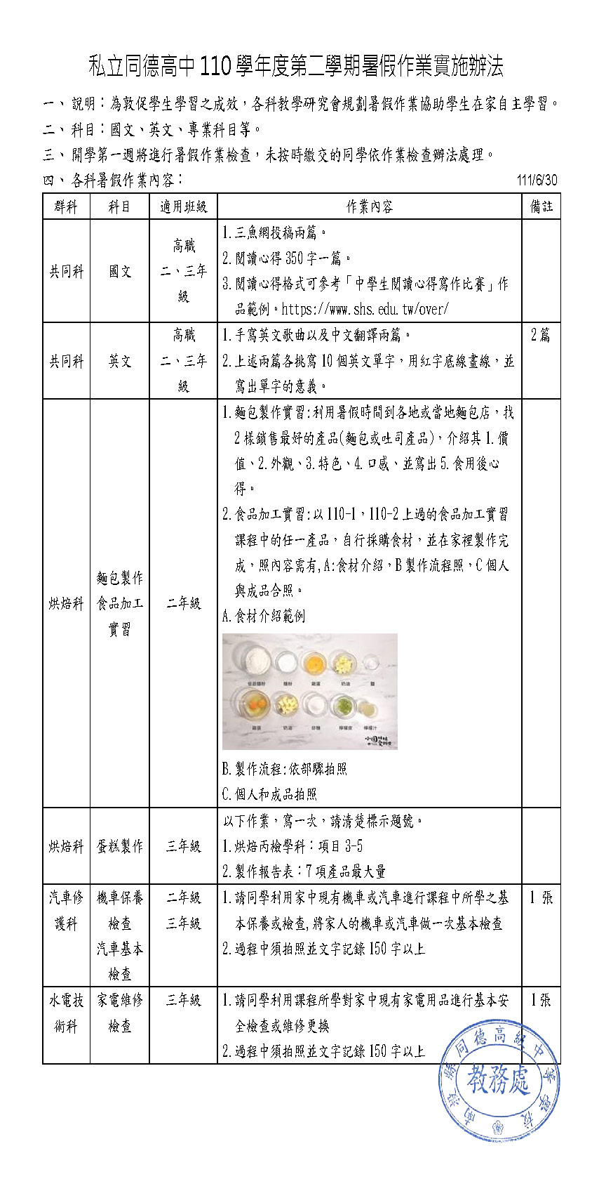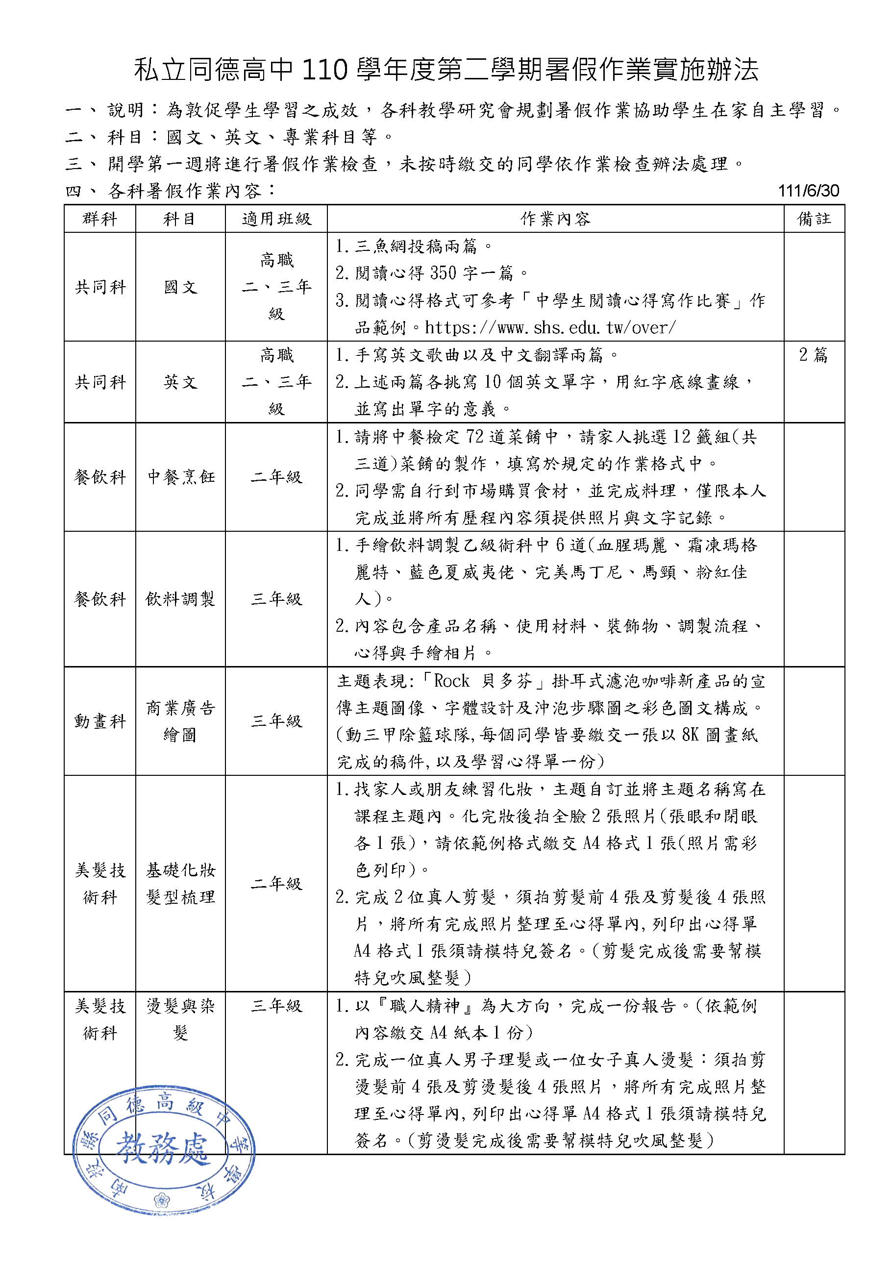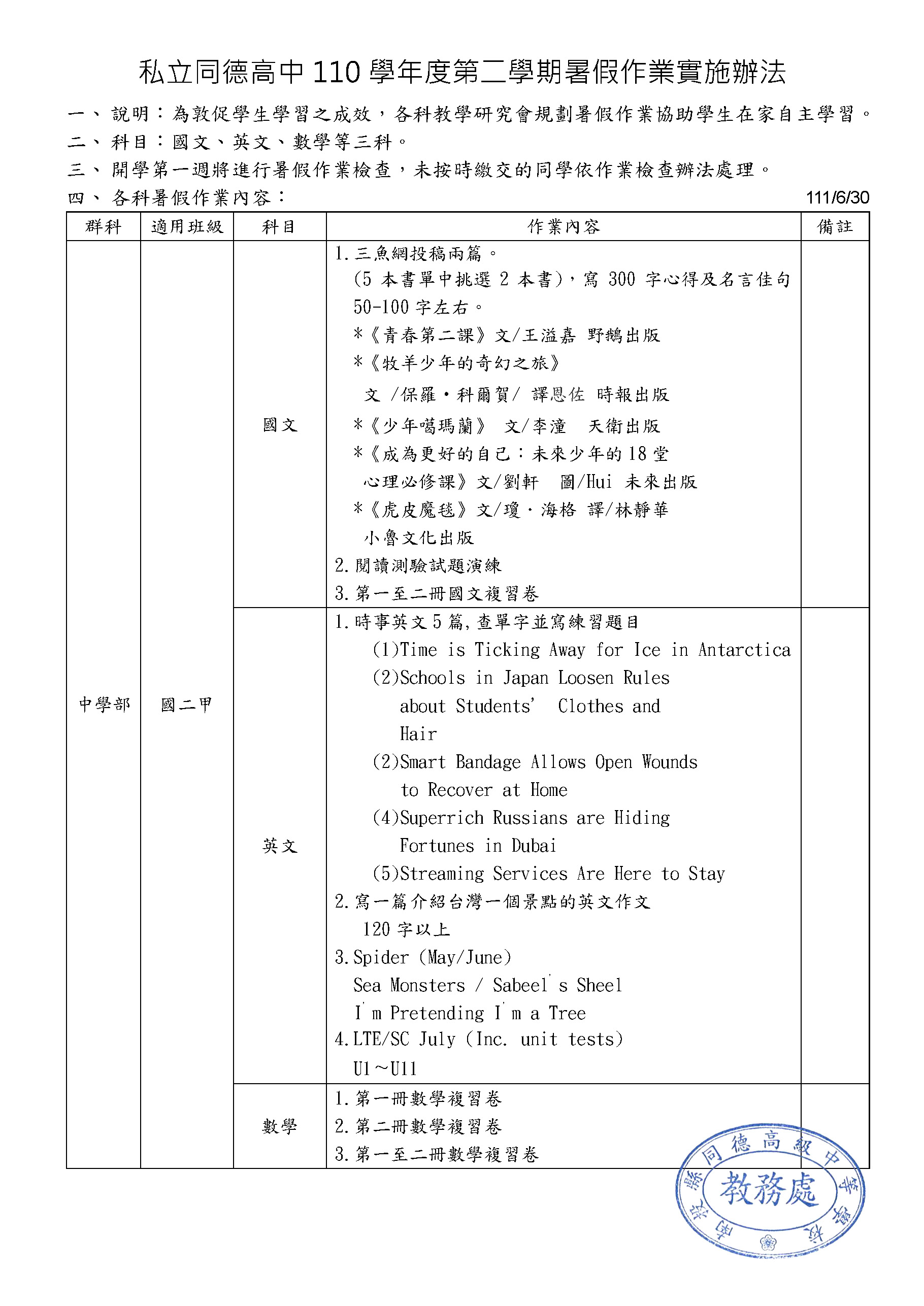 110-2暑假作業實施辦法