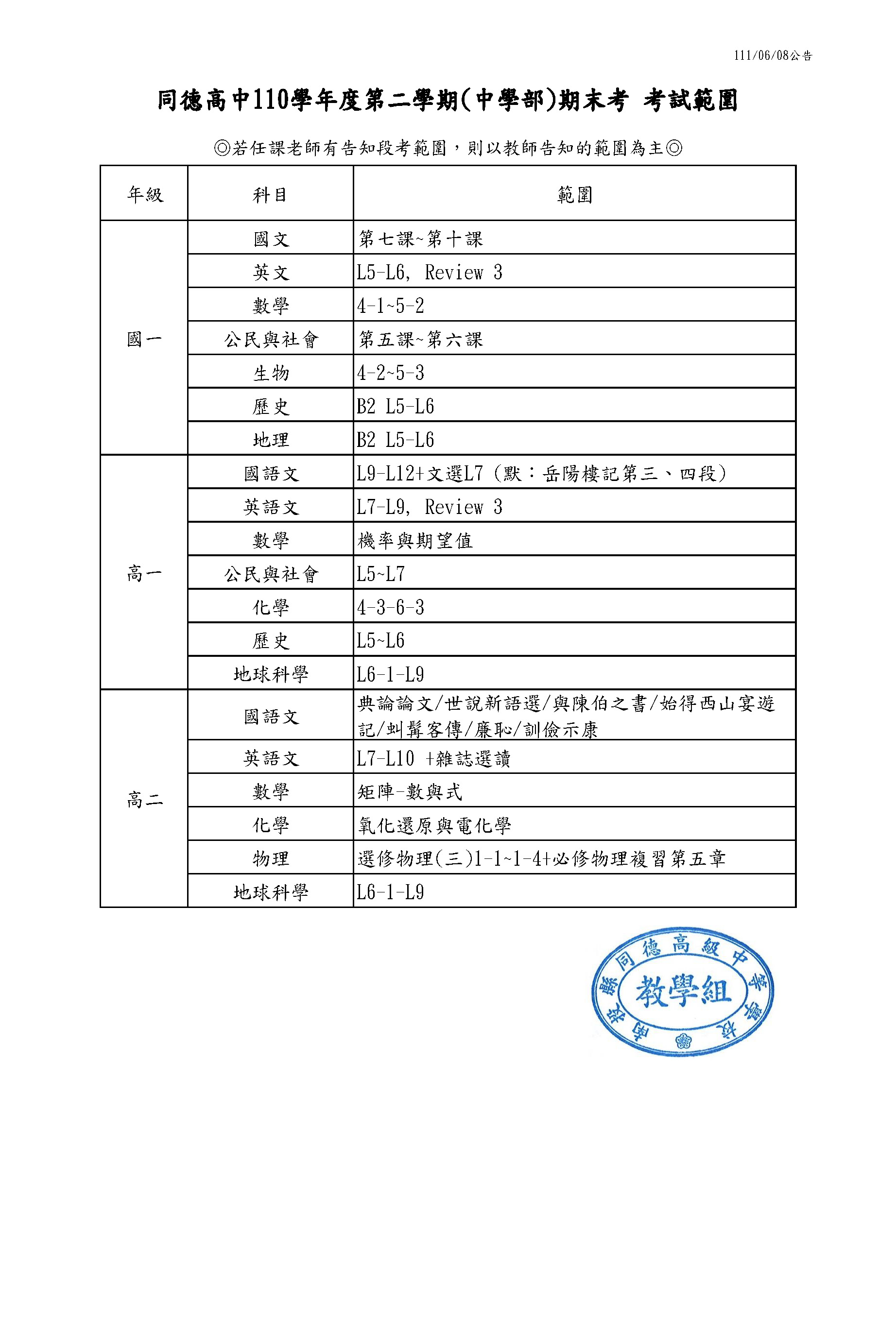 備註:以上各年級各科需依本校現有缺額決定錄取名額。