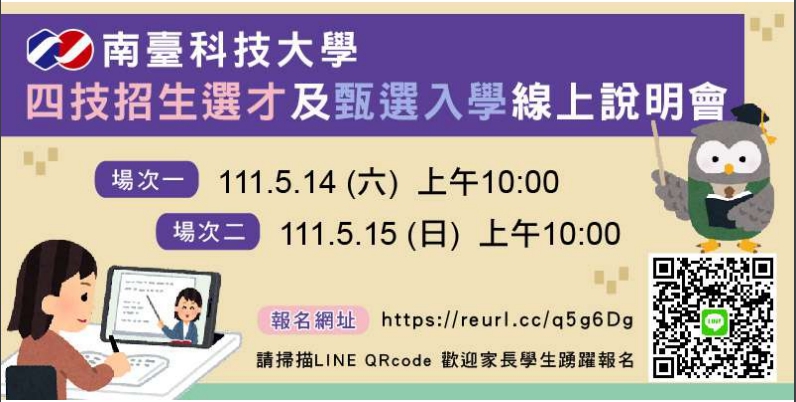 一、本校訂於111年05月14日(六)上午10:00及111年05月15日(日)上午10:00辦理「四技招生選才及甄選入學線上說明會」,報名網址:https://reurl.cc/q5g6Dg,相關報名資訊,請參閱附件。