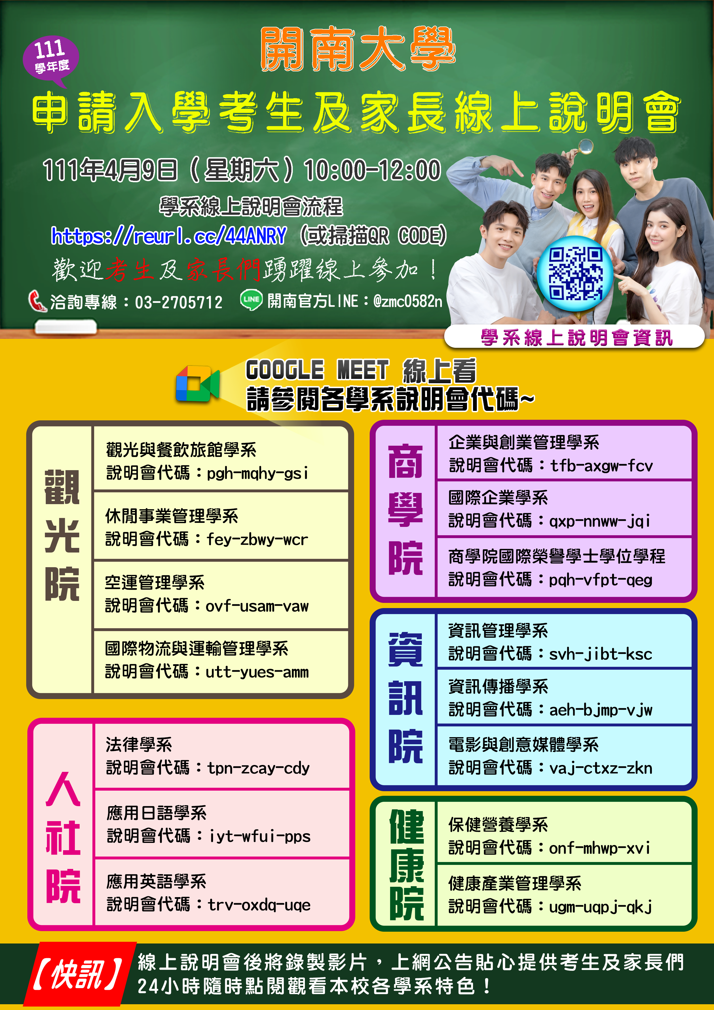二、原訂111年4月9日(星期六)上午10時至12時辦理「111學年度大學申請入學考生及家長說明會」,因疫情改為「線上說明會」,詳情請參閱本校招生處網頁公告(網址:https://reurl.cc/44ANRY)。