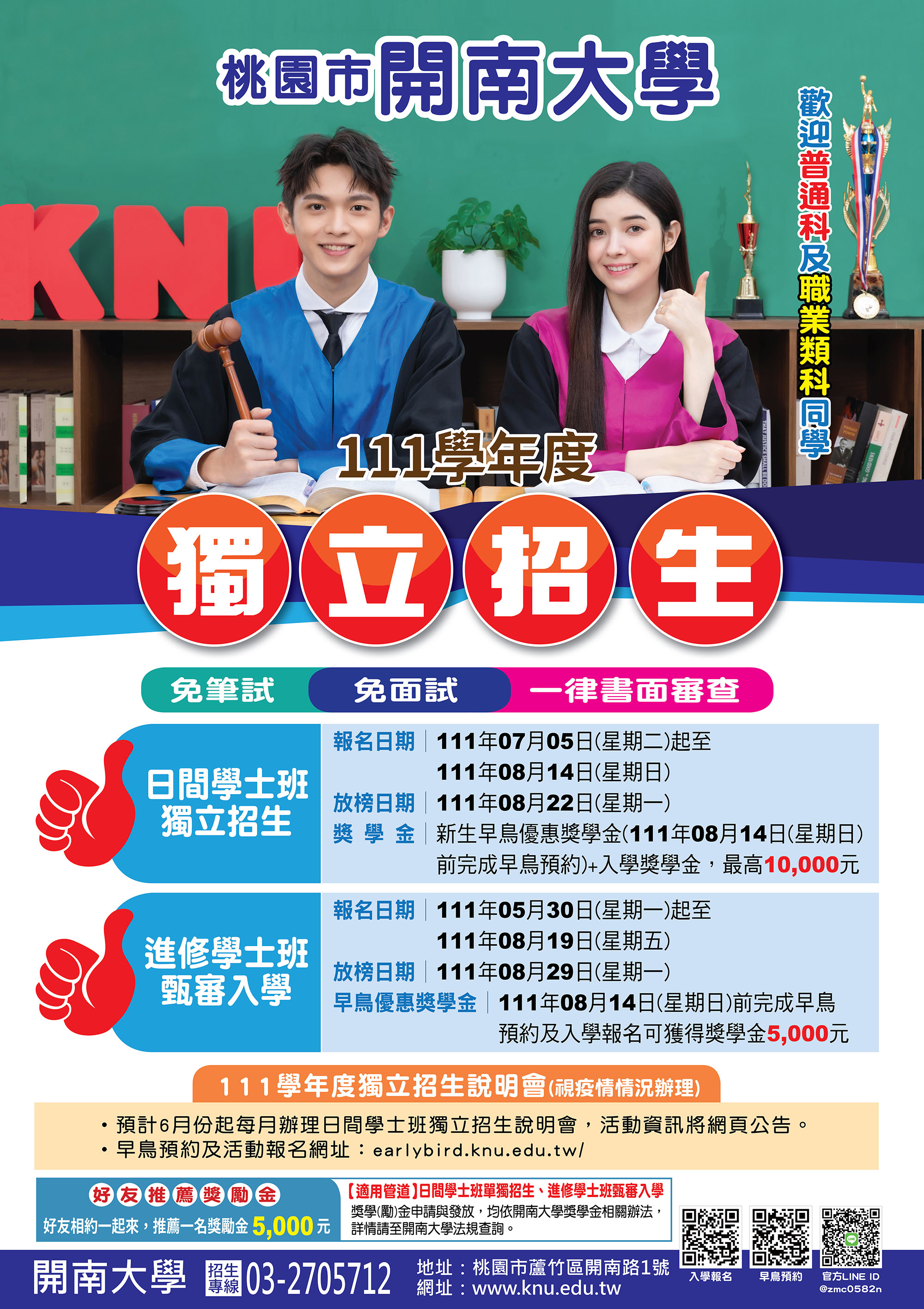 二、為增進考生與家長對於升學資訊之理解,本校規劃於111年6月份起每月辦理「111學年度日間學士班單獨招生說明會」將因應疫情狀況彈性辦理,活動資訊將於本校首頁公告,網址:https://www.knu.edu.tw