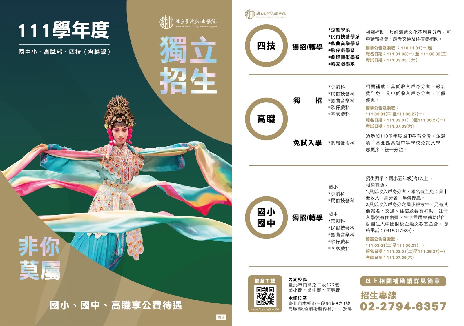 (一)轉學獨立招生:京劇科、民俗技藝科、戲曲音樂科、歌仔戲科、客家戲科,僅招收高職一年級學生。