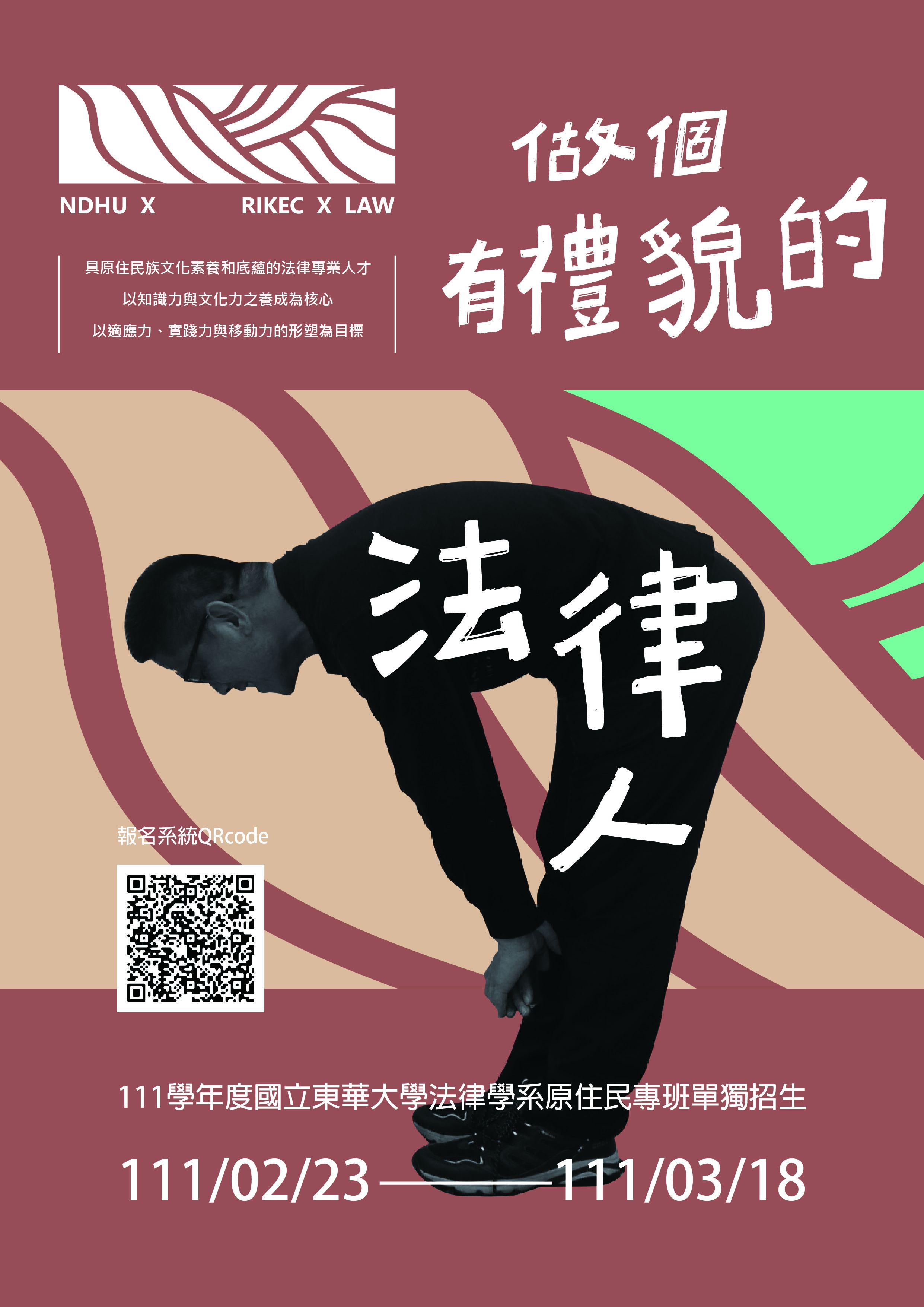 一、本校奉教育部成立國立東華大學法律學系原住民專班,招生資訊如下: