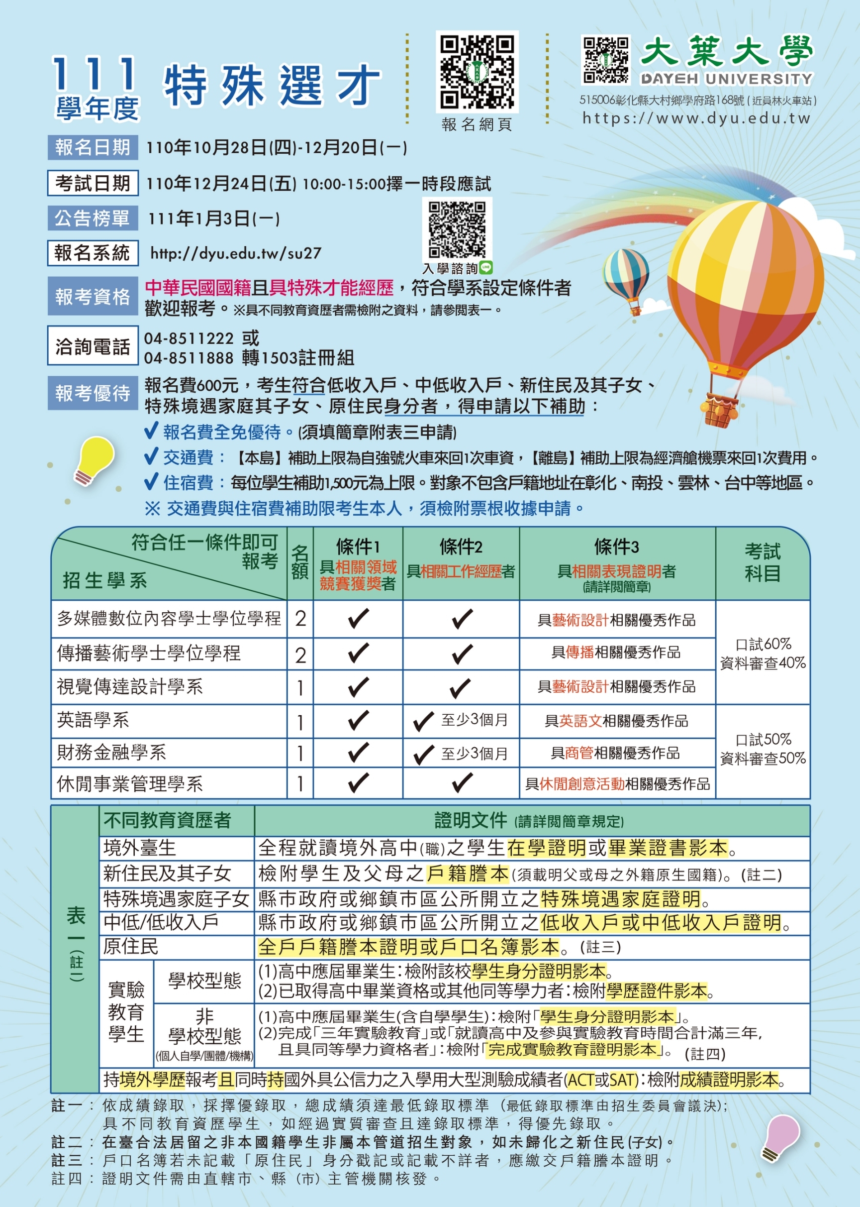 一、招生簡章電子檔公告於本校網頁http://dyu.edu.tw/su27,歡迎免費下載。