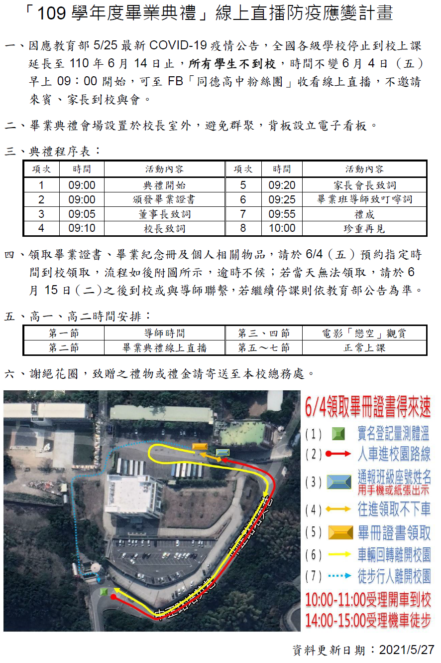 主旨:有關全國高級中等以下學校學生於110年5月19日(星期三)至5月28日(星期五)因應疫情停止到校改採居家線上學習一案,詳如說明,請查照。