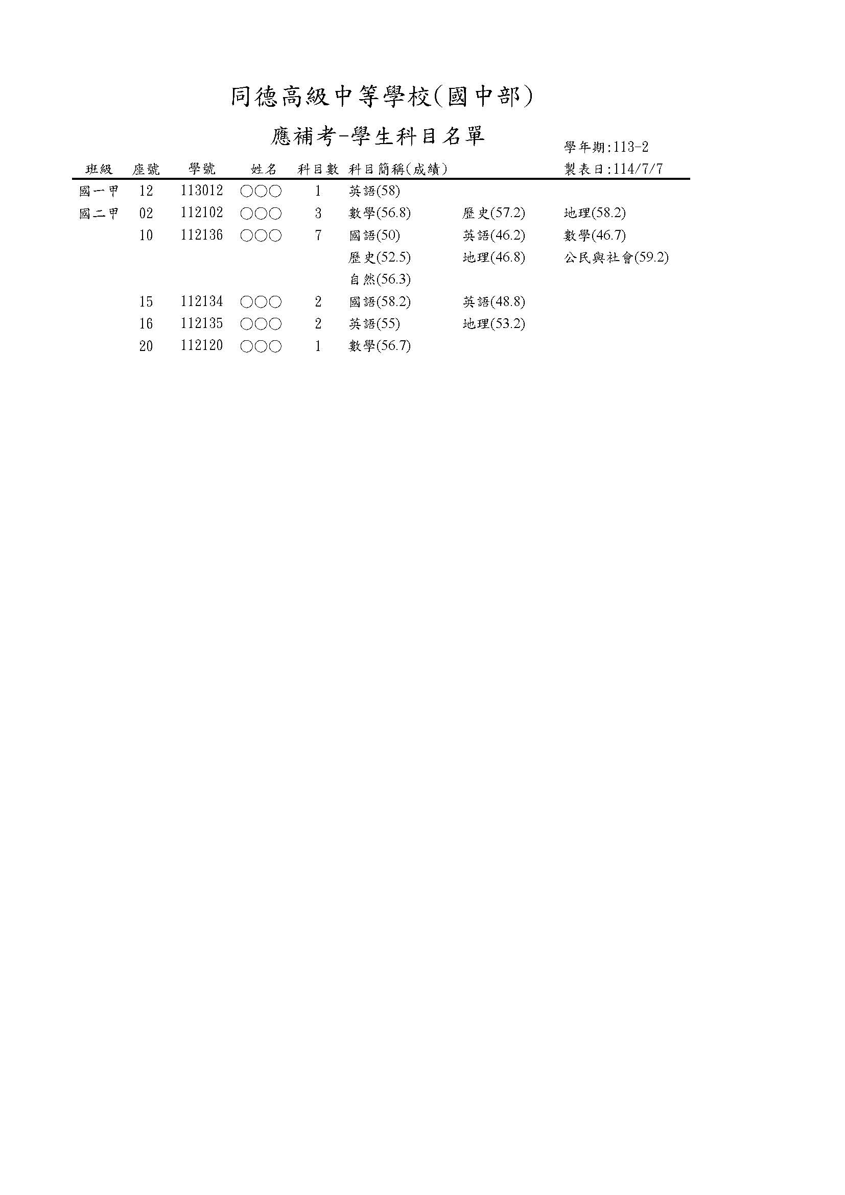 113學年度第2學期國中部各項成績查看與補考名單公布與成績查看: