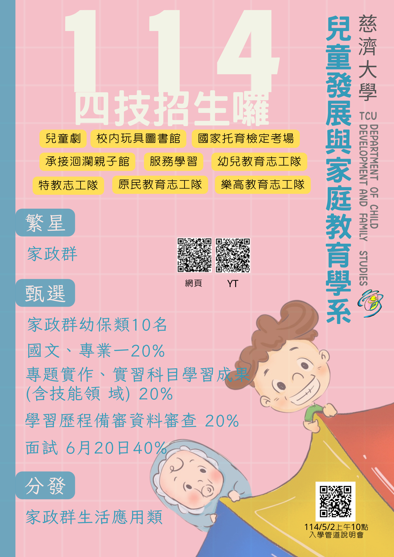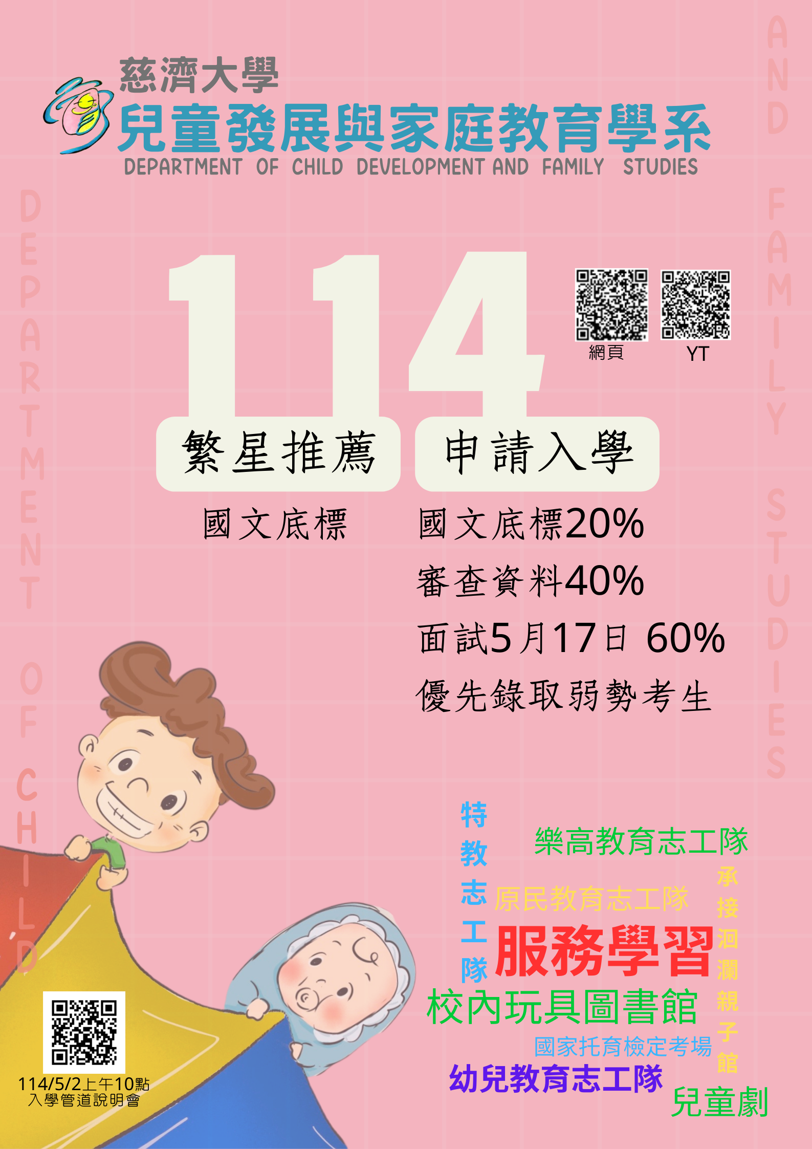 四、另於114年5月2日上午10點,舉辦線上招生管道說明會,Google Meet連結:https://meet.google.com/xjn-fdriuhg,歡迎考生線上參與認識本校兒童發展與家庭教育學系。