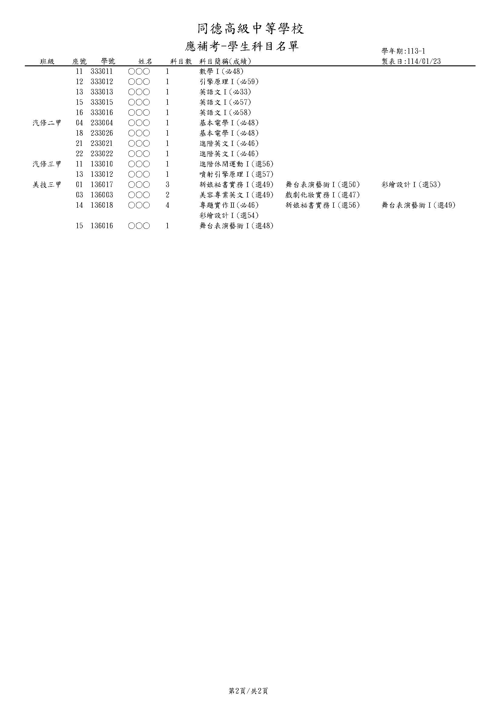 113學年度第1學期高中各項成績查看與補考名單公布與成績查看:
