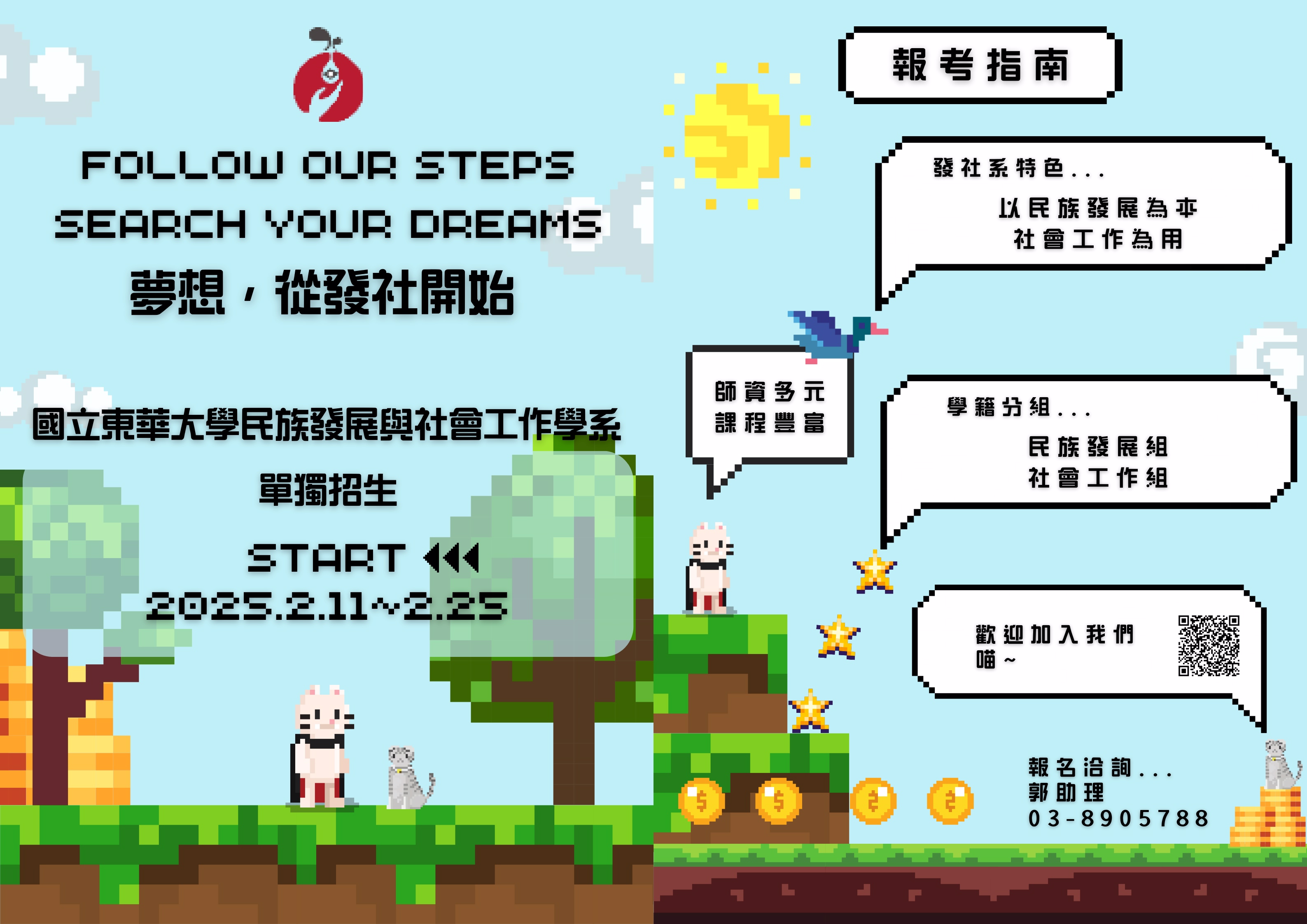 六、欲更加了解本校發社系,歡迎加入或關注發社系FB社團(搜尋:國立東華大學民族發展與社會工作學系);相關問題歡迎逕與本校發社系辦公室聯絡,電話:03-8905788,EMail:tefi@gms.ndhu.edu.tw,或加入發社系官方LINE群組(Line ID搜尋@503pwyqr)詢問。