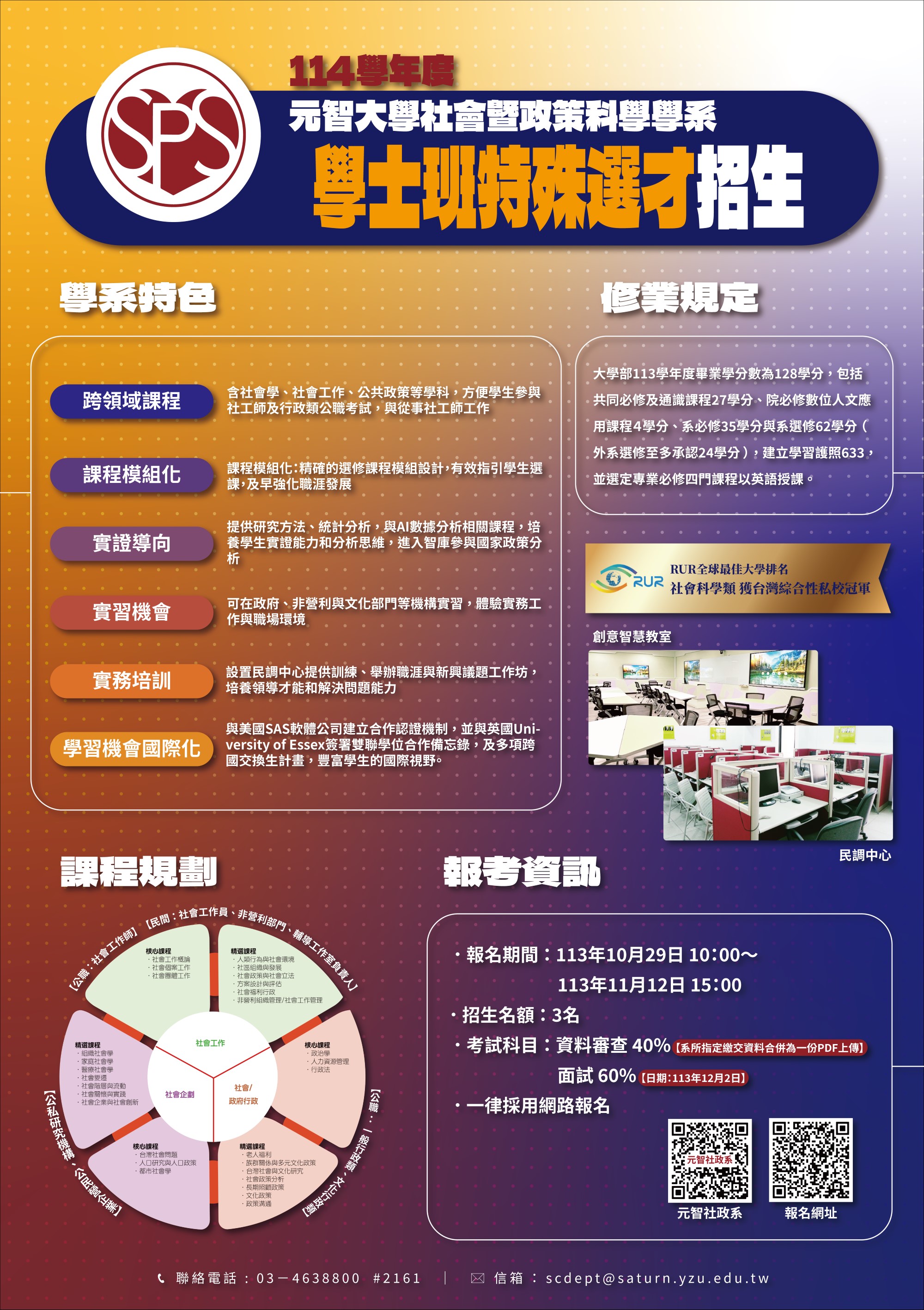 一、元智大學社會暨政策科學學系招生資訊網址:https://www.yzu.edu.tw/admissions/