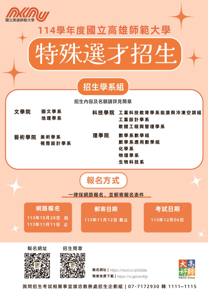 一、本校114學年度特殊選才將於113年10月21日(一)報名至113年11月14日(四)止。招生名額共89名(甲組27名、乙組59名、丙組3名)。
