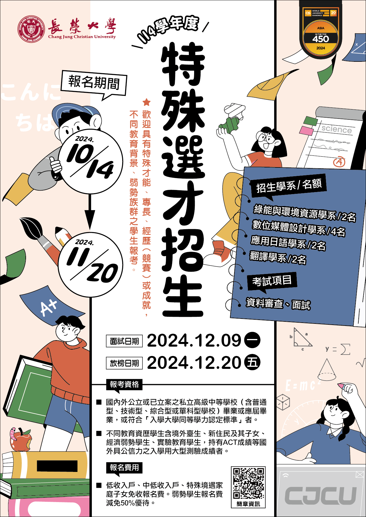 一、本校114學年度學士班特殊選才招生簡章已開放考生上網查詢或下載列印,簡章下載網址:http://cjcu.tw/r/uVKcby。