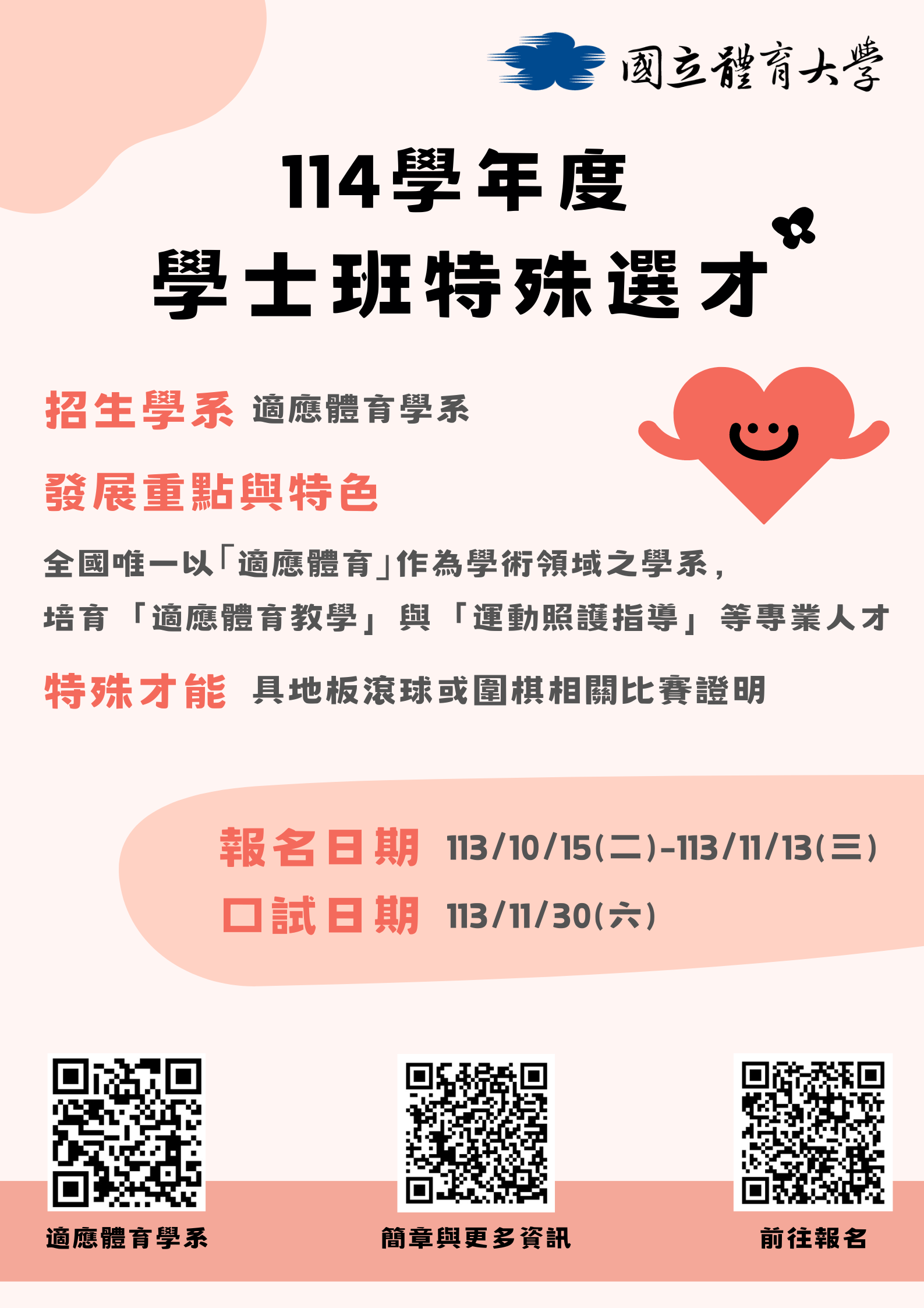 一、旨揭招生學系為本校適應體育學系(網址: https://ape.ntsu.edu.tw/)