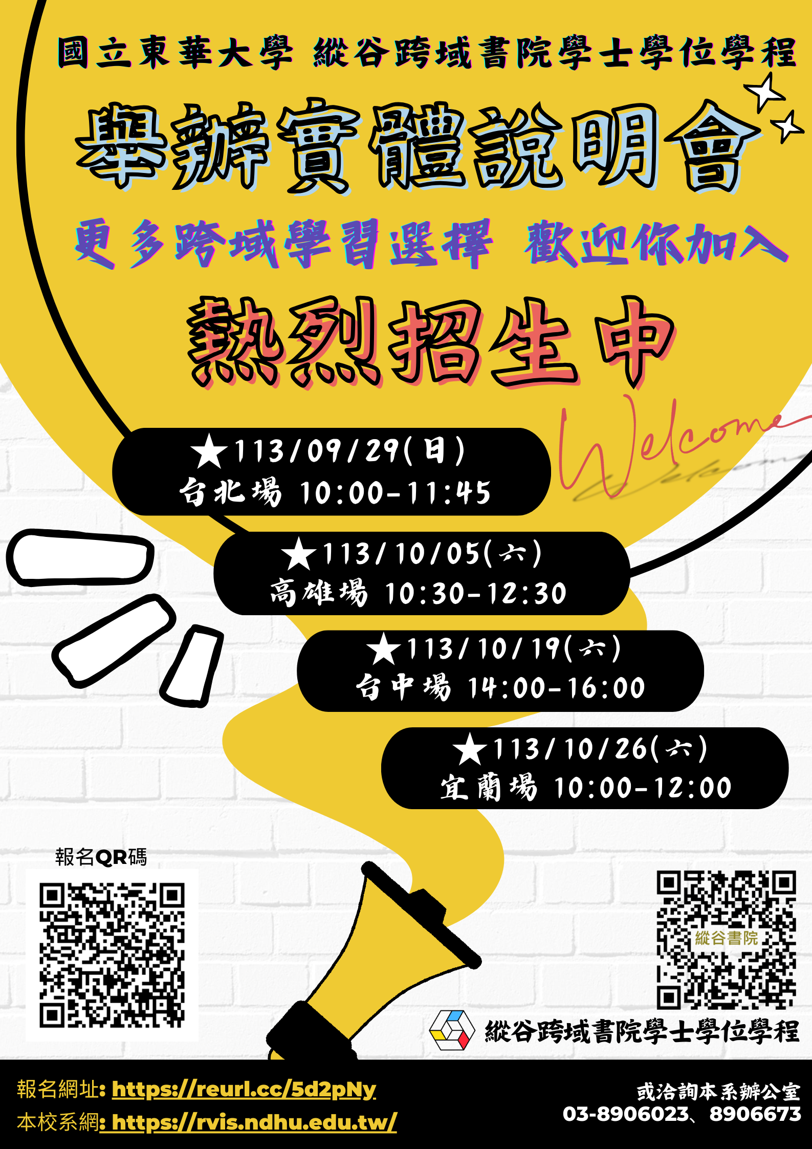 訊,訂於113年10月12日(六)下午1點30分於本校辦理「114學年度招生說明會」,活動當天備有接駁車服務及提供午餐,歡迎各位考生、家長及高中師長於10月10日(四)前踴躍上網報名參加。報名網址:https://reurl.cc/Gpanj3
