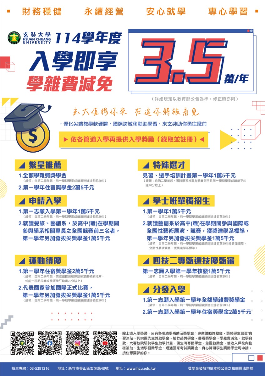 一、本校為鼓勵優秀高中(職)學生入學,特訂定「入學績優獎助學金獎勵規定」,提供給各管道優秀新生申請,資訊公告於本校網站(https://www.hcu.edu.tw/newstu/zh-tw/)。