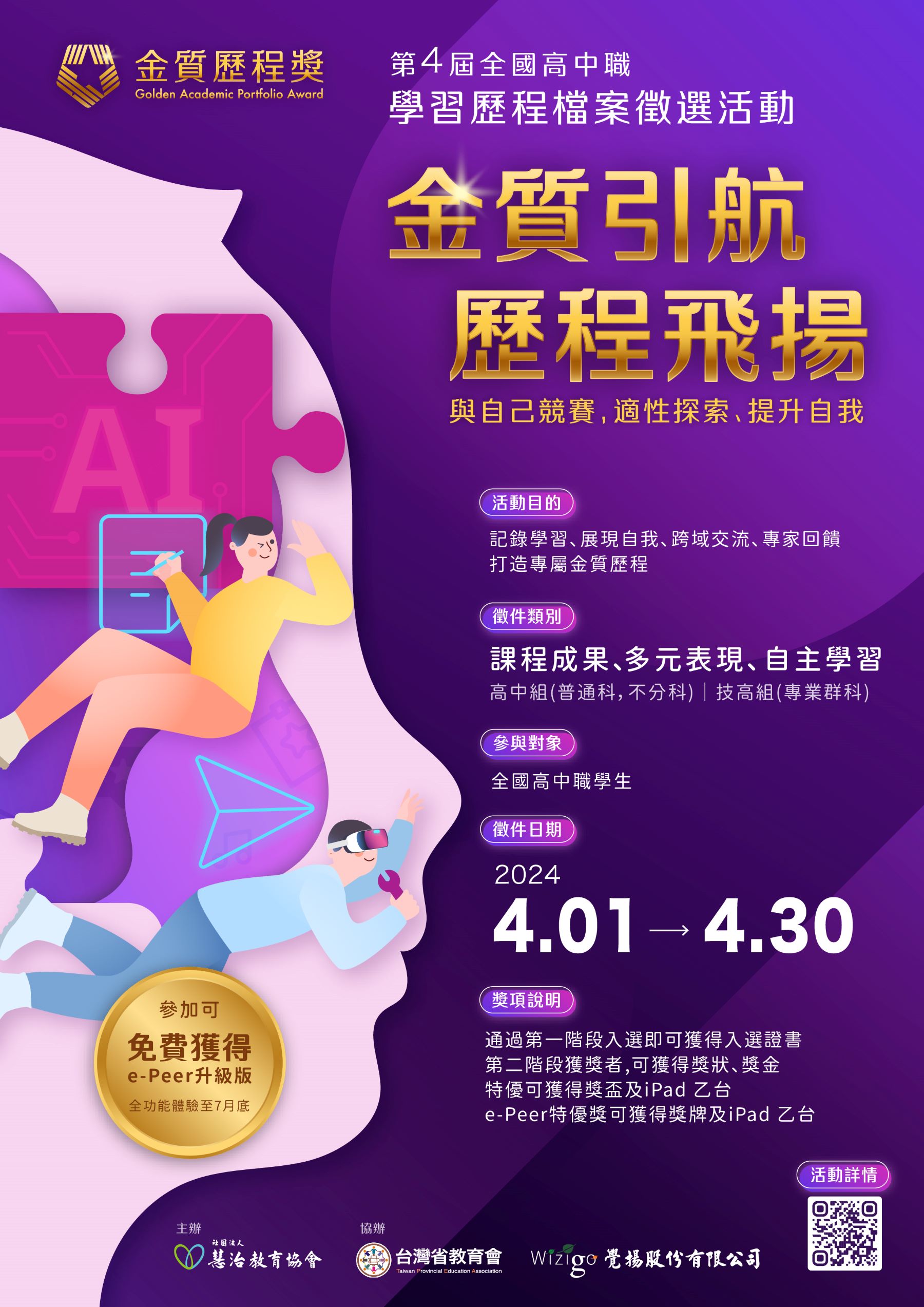 一、社團法人慧治教育協會為了促進跨校交流,並提供學生展現自我的舞台,特舉辦全國高中職學習歷程檔案徵選活動【金質歷程獎】,鼓勵學生實踐所學,豐富學習歷程檔案,除了可獲得書審老師給予的實質回饋、了解學習歷程檔案製作的重點之外,獲獎學生也有機會受邀公開分享作品成果,培養邏輯思考及口語表達能力,奠定自主學習的基礎,是一個與自己的競賽,進而適性探索、提升自我的機會。歡迎貴校教師鼓勵學生參與,凡報名參加的學生皆能免費使用e-Peer共學平臺升級版記錄學習軌跡、彙整亮點成果,將學習經驗打造成金質歷程!
